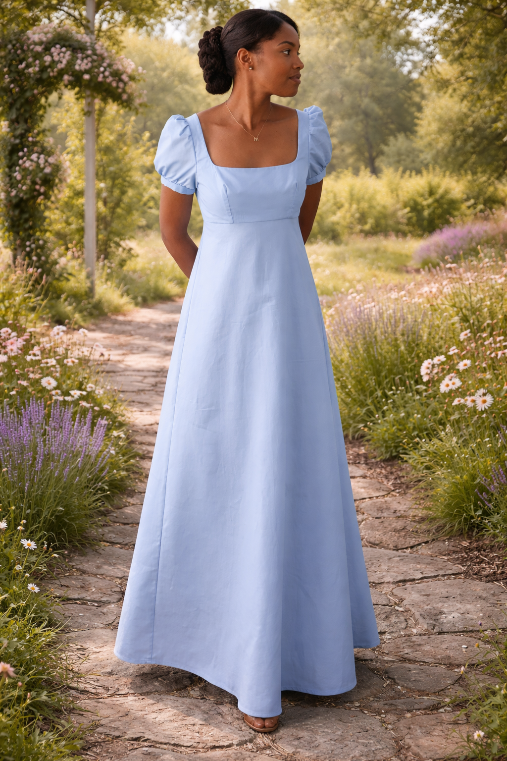 Regency era inspired dress in light blue cotton with an A-line chemise silhouette. The dress has a four button closure at the back and classic gathered detail at the back waist.